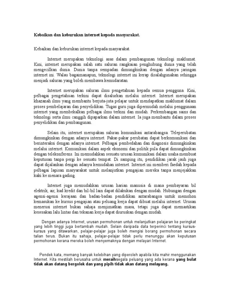 Jika kita menggunakan internet untuk tujuan baik maka banyak faedah boleh didapati . Hal ini kerana internet boleh mendatangkan pelbagai kesan kepada masyarakat dan negara. Huraikan kebaikan internet dalam kalangan masyarakat kini. Ianya memudahkan pencarian dan pengumpulan maklumat kepada sesiapa yang menggunakannya. Berikut dikongsikan contoh karangan kebaikan internet dan telefon pintar kepada masyarakat masa kini sebagai rujukan. Internet merupakan sistem komunikasi yang menyalurkan maklumat dan . Internet merupakan teknologi asas dalam pembangunan teknologi maklumat. Internet boleh mendatangkan pelbagai kesan kepada masyarakat dan negara. Ianya memudahkan pencarian dan pengumpulan maklumat kepada sesiapa yang menggunakannya. Pada pendapat saya, kita hendaklah menggunakan internet dengan baik.